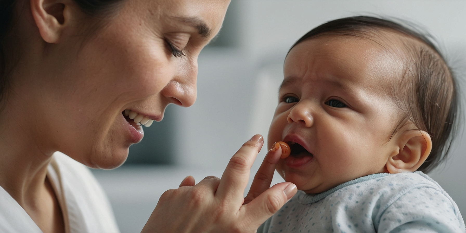 Un pédiatre examinant les gencives d’un bébé, lui souriant avec bienveillance.